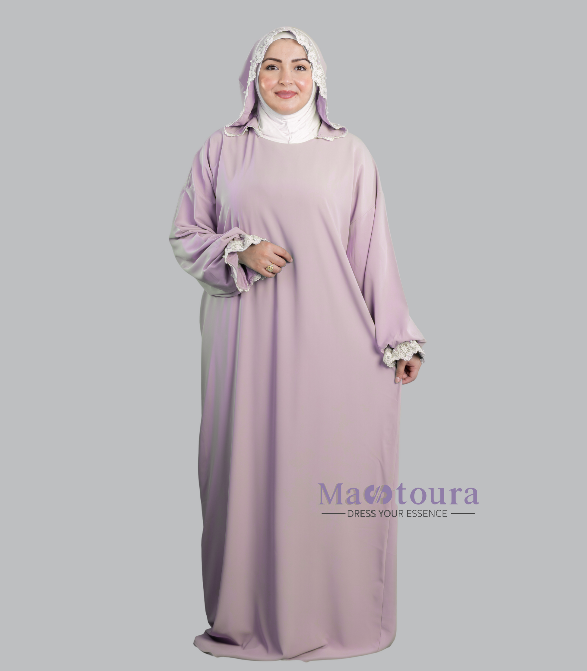 L'abaya de prière est disponible dans cinq couleurs différentes : Rose, Vert, Mauve, Blanc casse et Noir, offrant ainsi aux clients un choix varié pour répondre à leurs préférences individuelles.