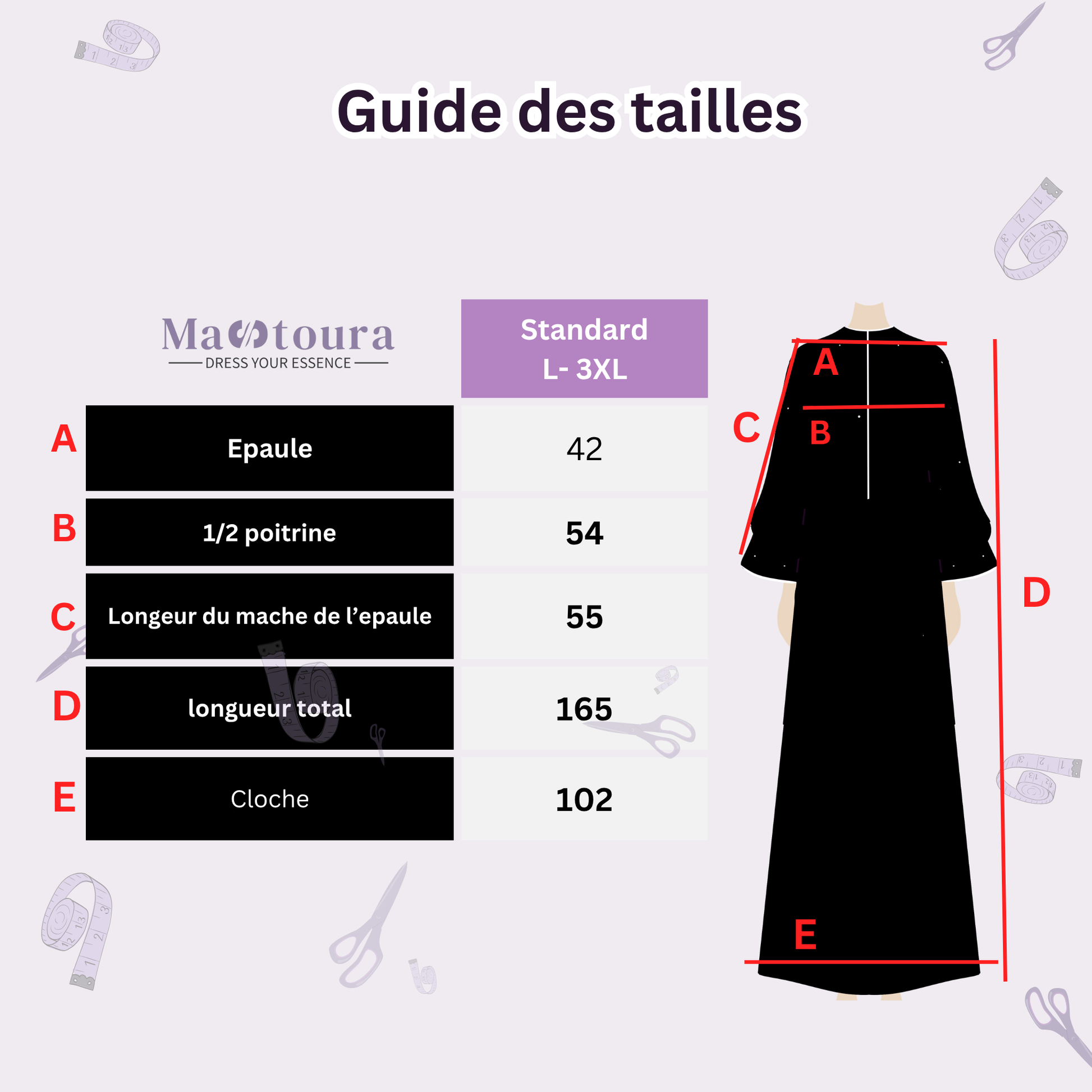 استمتعي بإطلالة راقية تجمع بين الحشمة والأناقة مع فستان نُوَّار المصمَّم خصيصًا ليمنحك الشعور بالثقة والراحة طوال اليوم. يتميز هذا الفستان بقصّته الطويلة الانسيابية التي تغطي الجسم بأناقة، مع تفاصيل ناعمة تضفي لمسة أنثوية ساحرة.